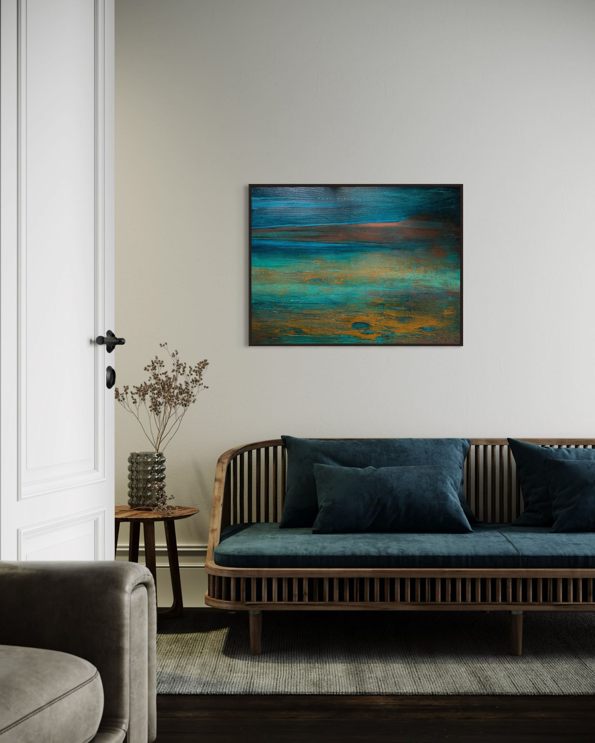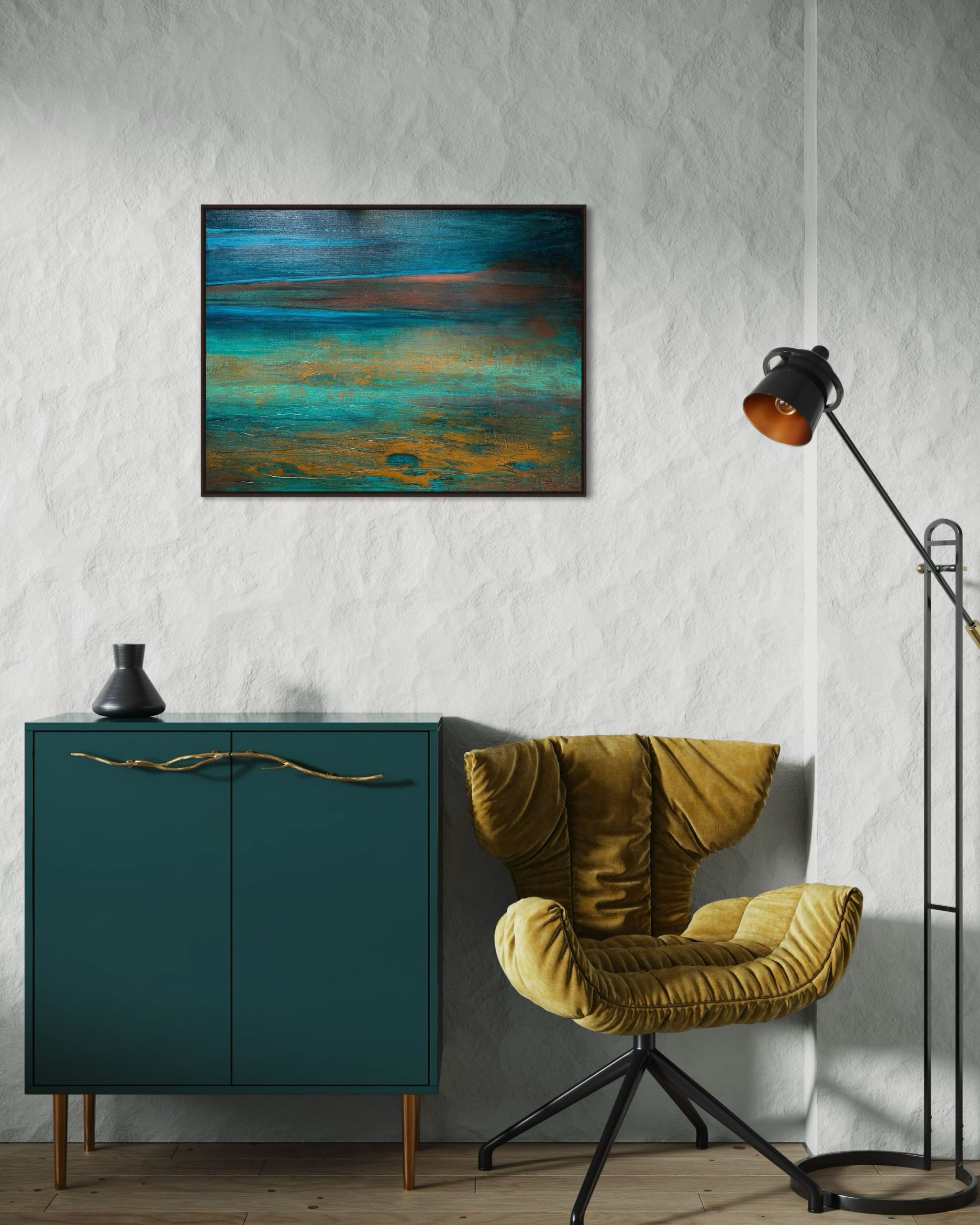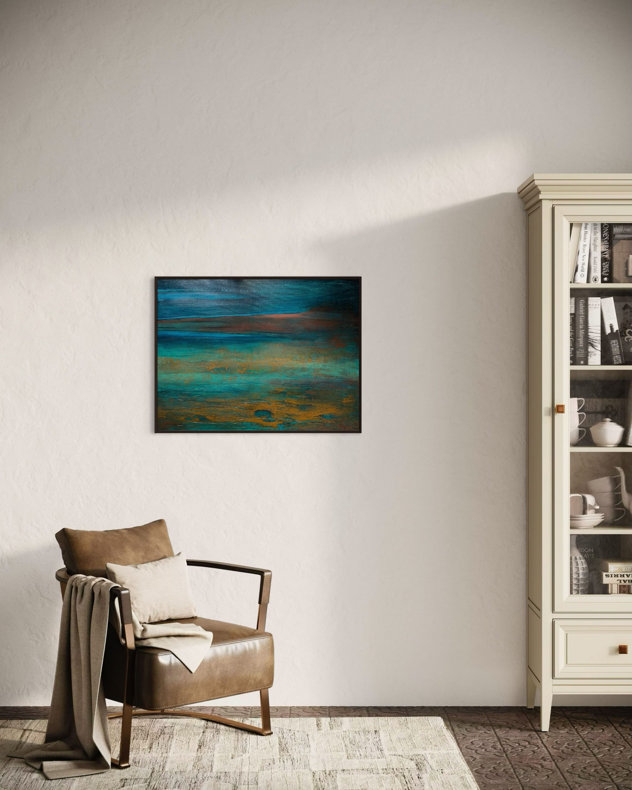 Dein Kunstwerk zieht den Betrachter in eine mystische Welt, in der Tiefe und Geheimnis verschmelzen. Die kraftvollen Farbnuancen und die sanften Übergänge laden dazu ein, verborgene Ebenen zu erkunden und in eine faszinierende Stille einzutauchen.