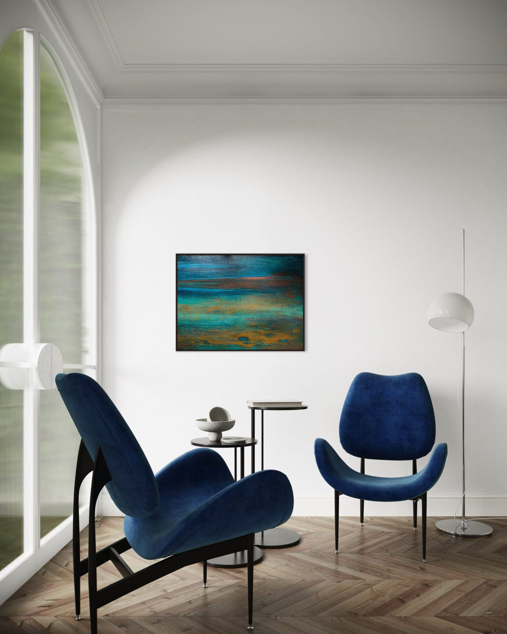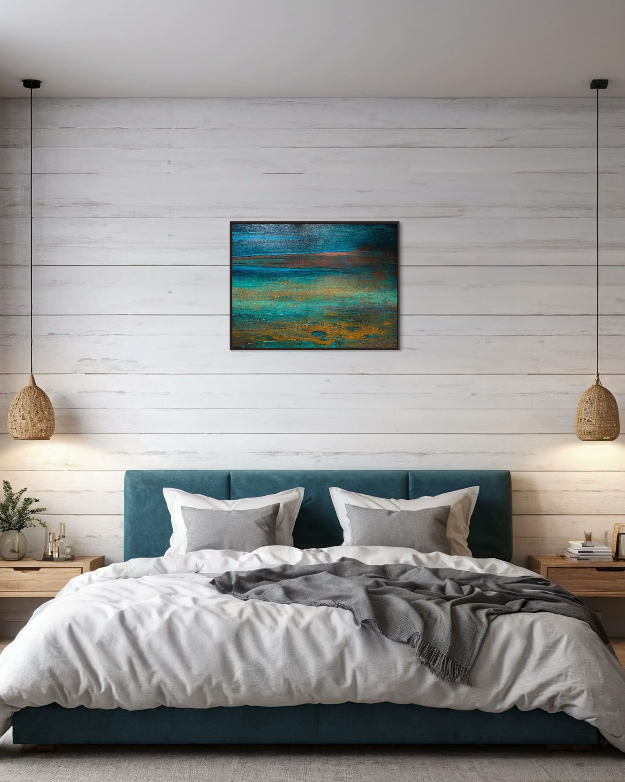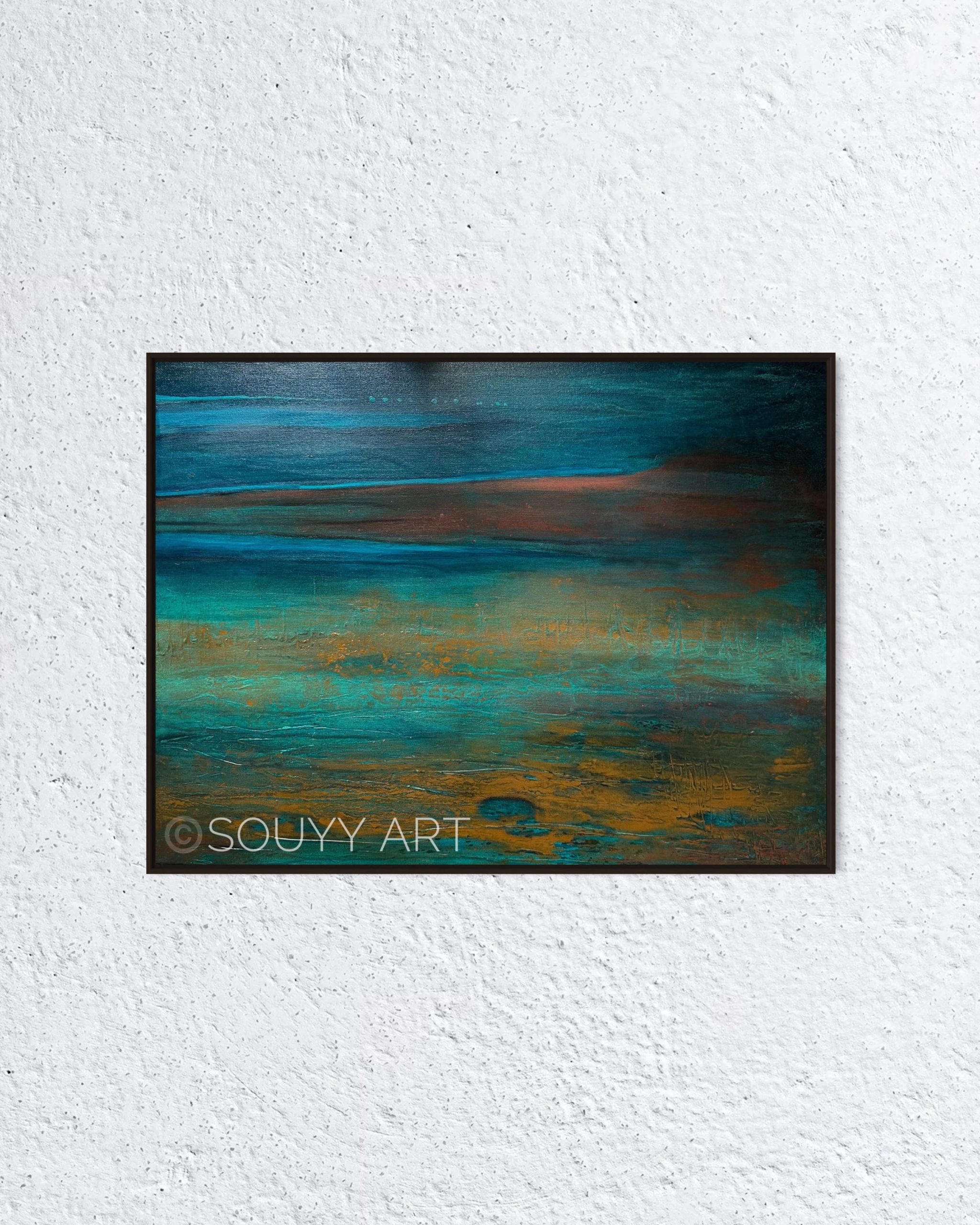 Dein Kunstwerk zieht den Betrachter in eine mystische Welt, in der Tiefe und Geheimnis verschmelzen. Die kraftvollen Farbnuancen und die sanften Übergänge laden dazu ein, verborgene Ebenen zu erkunden und in eine faszinierende Stille einzutauchen.
