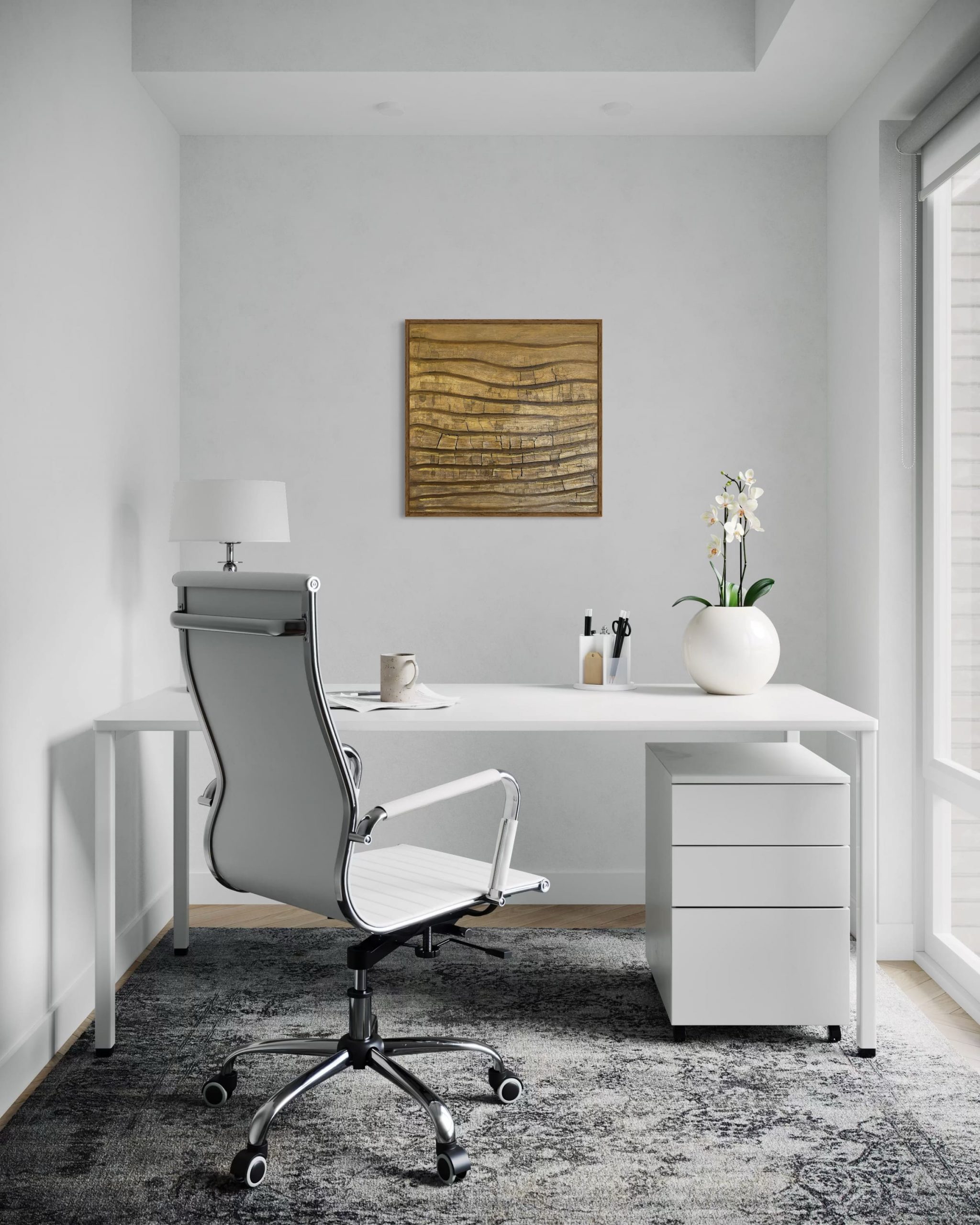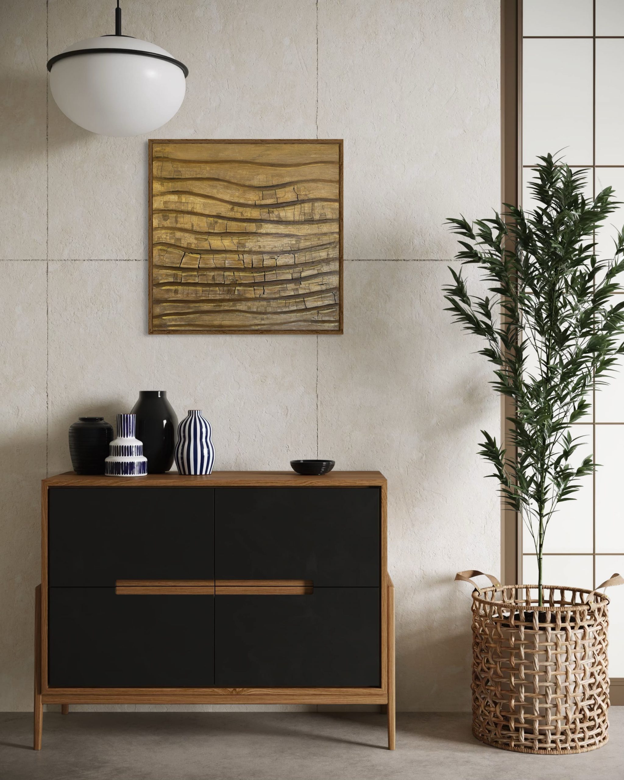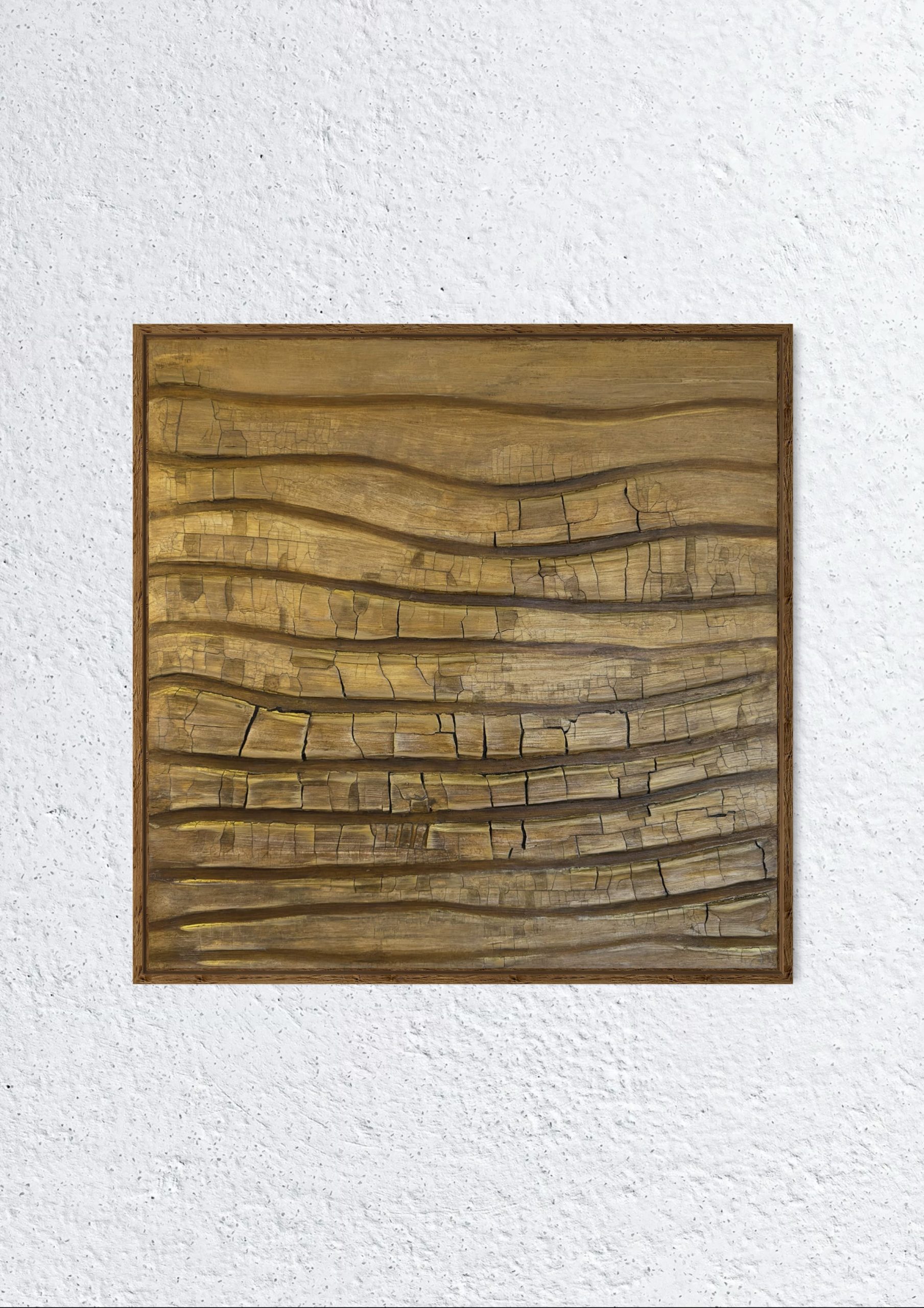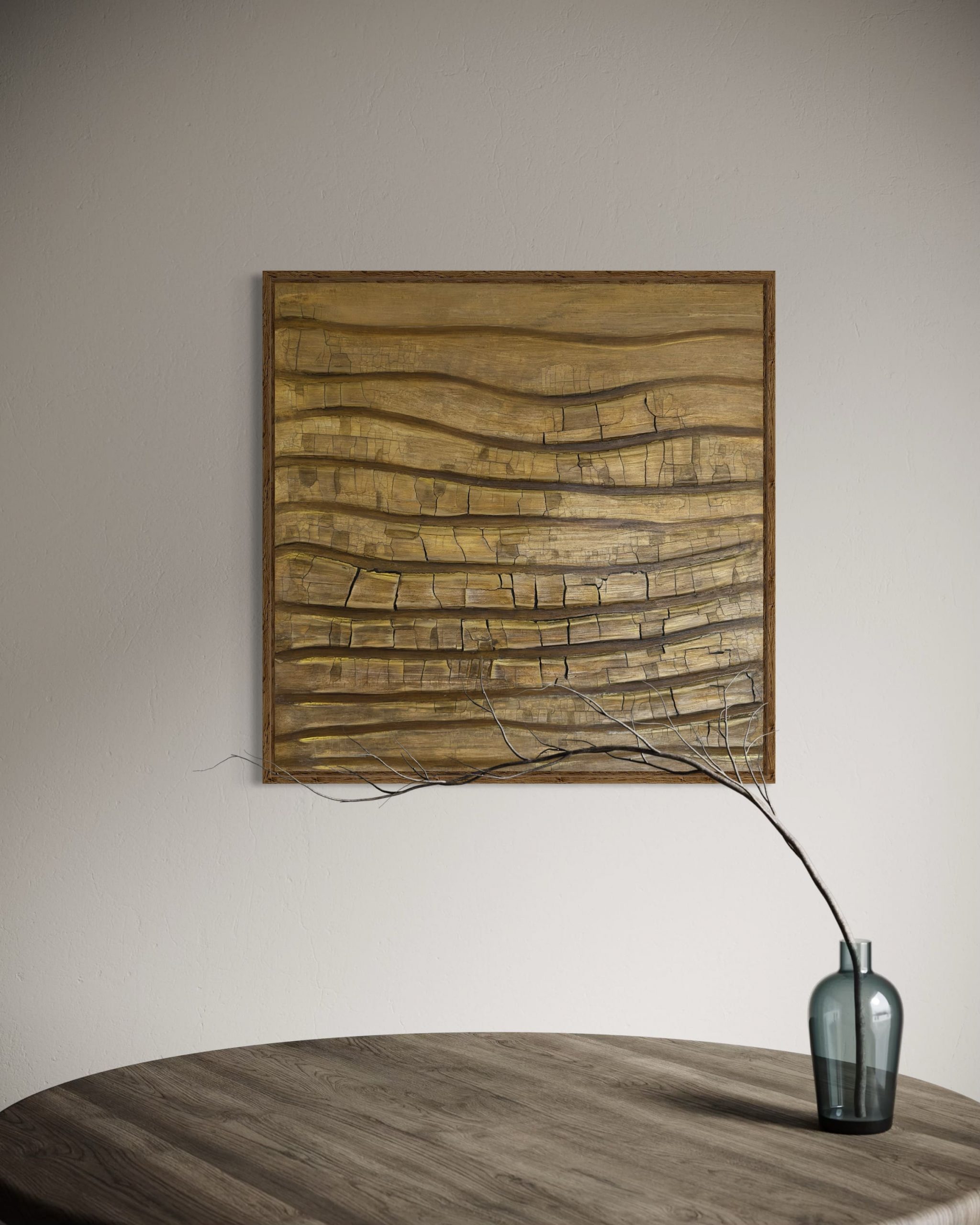 Holz erinnert. An Wurzeln tief in der Erde, an Wege, die sich verzweigen. Es bricht. Es heilt, es wächst weiter. Sein Duft- eine Spur von Beständigkeit. Kunstwerk gerahmt in Eichenholz.